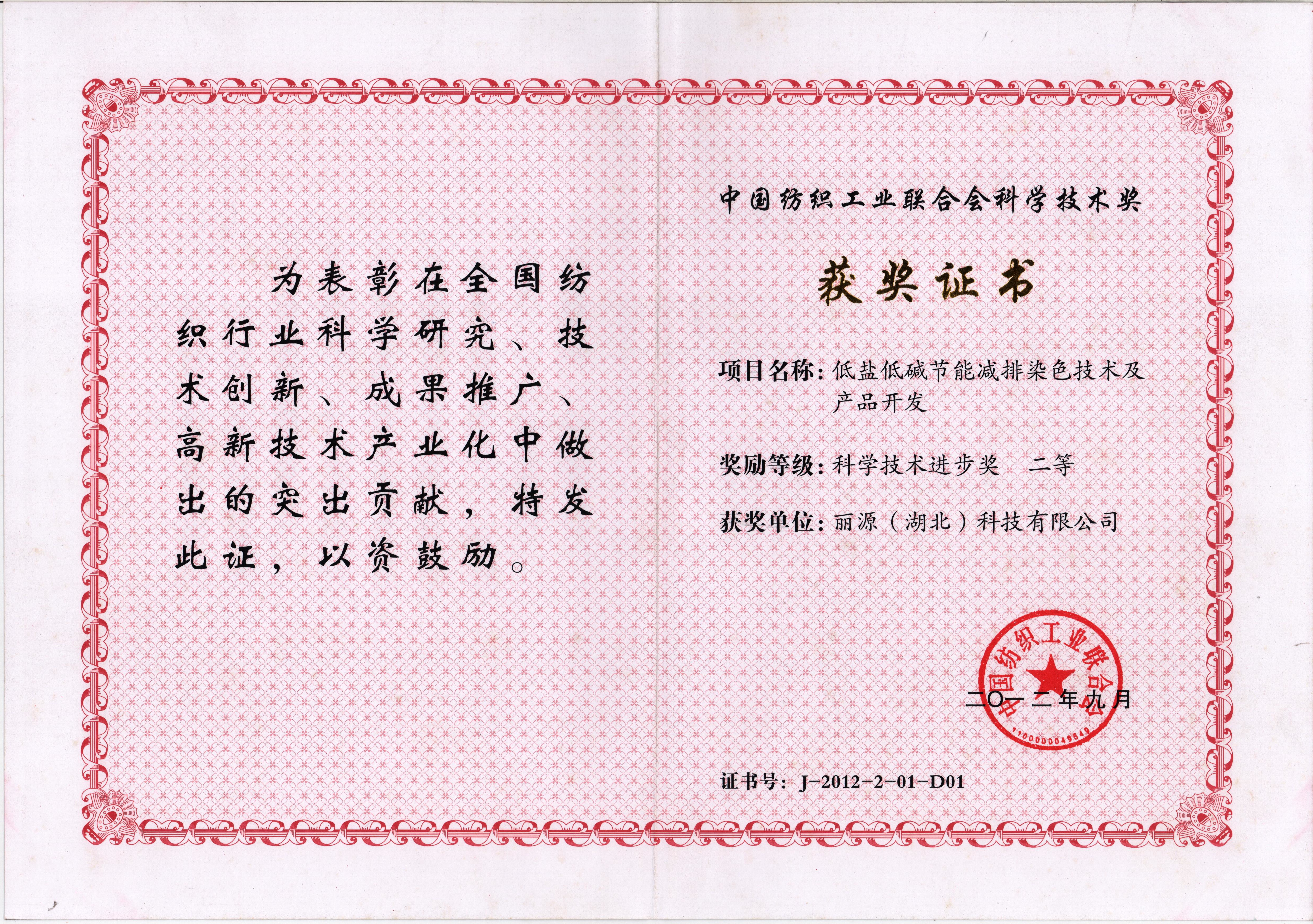 • 2012年9月,丽源科技低盐低碱节能减排染色技术及产品开发项目获得由中国纺织工业联合会颁发的「科学技术进步奖二等奖」