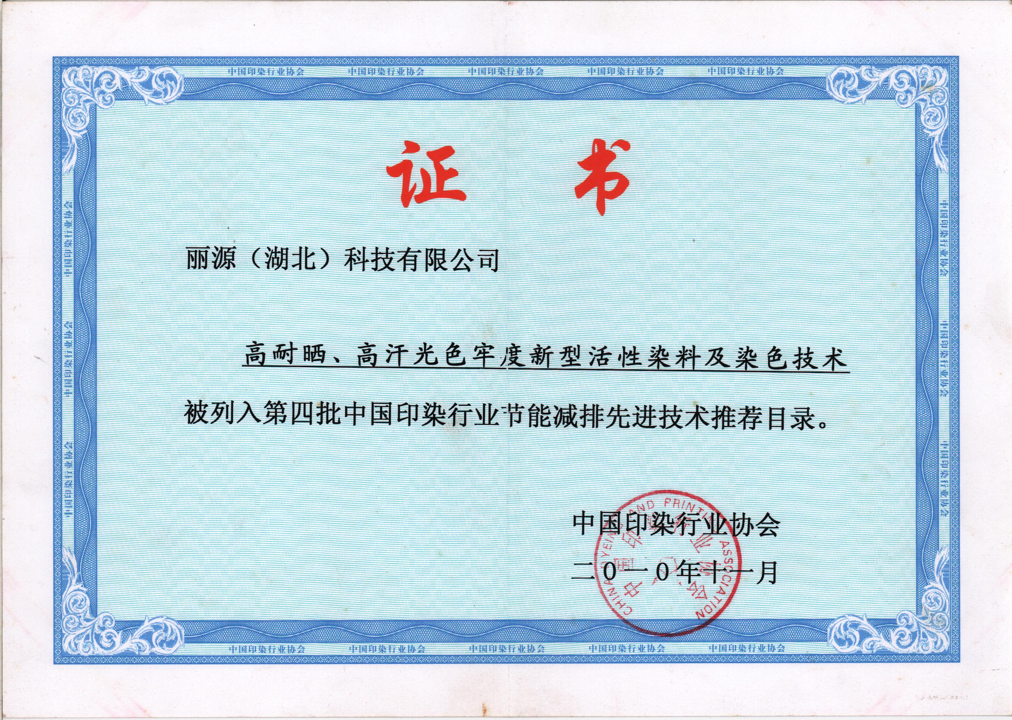 • 2010年11月,丽源科技高耐晒高汗光色牢度新型活性染料及染色技术被中国印染行业协会列入第四批「中国印染行业节能减排先进技术推荐目录」