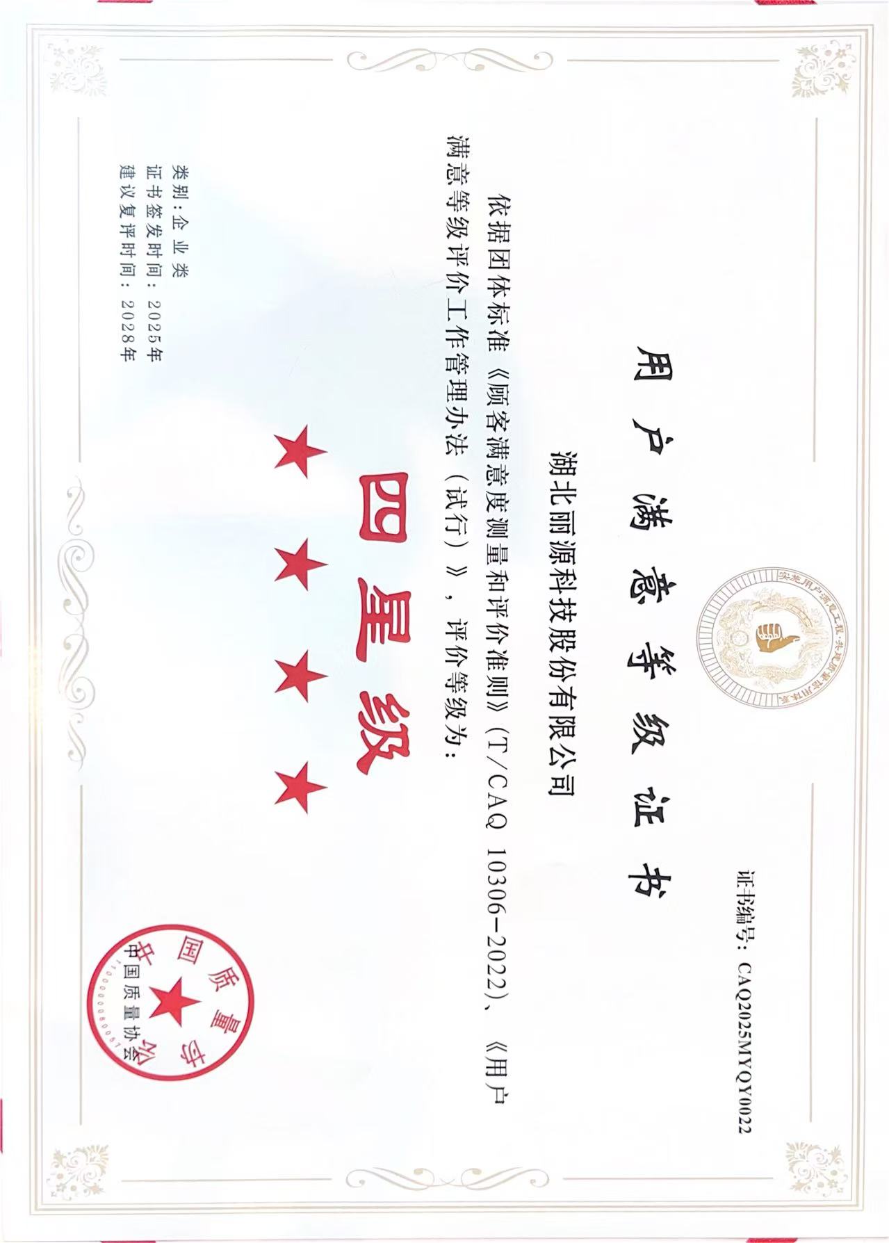 2025年12月,丽源科技被认定为「全国用户满意四星级企业」
