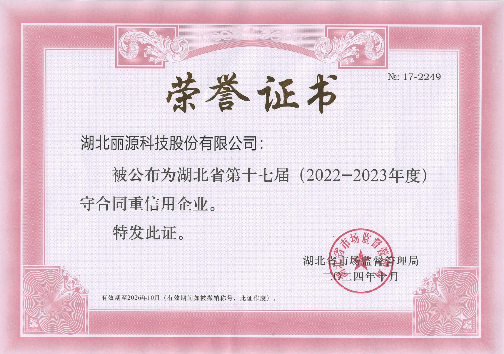 2024年10月,丽源科技被评为「湖北省&荆州市第十七届守合同重信用企业」